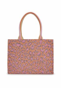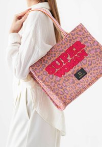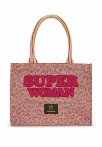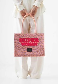 Personne vêtue de blanc tenant un sac fourre-tout imprimé léopard rose et orange avec l'inscription "SUPER WOMAN" en lettres rouges épaisses.
