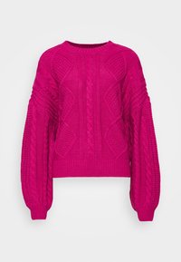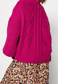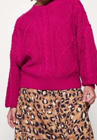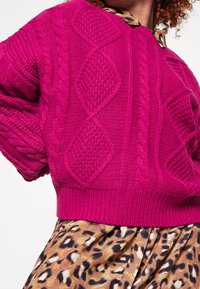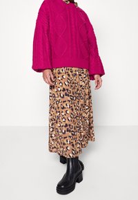 Personne portant un pull en maille torsadée magenta vif et une jupe à imprimé léopard boutonnée, tenant le tissu de la jupe d'une main.