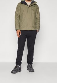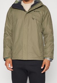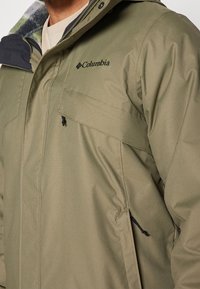 Homme portant une veste Columbia vert olive avec fermeture éclair et poches à rabat, pantalon noir, et polaire visible au niveau du col et des poignets.