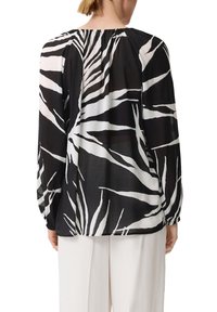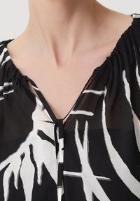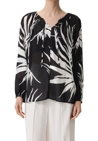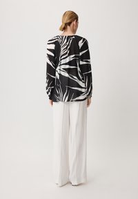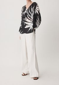 Blouse noire transparente avec des motifs abstraits de feuilles blanches, manches longues, encolure froncée avec un lien devant, portée avec un pantalon blanc.