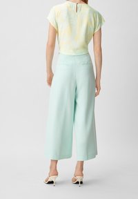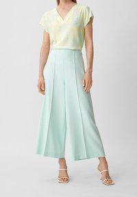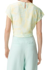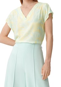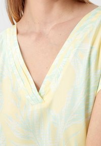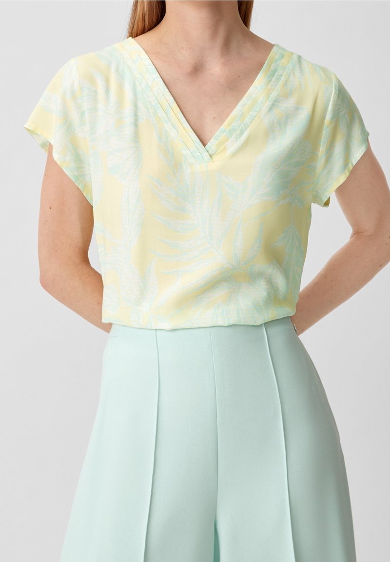 Femme portant un top jaune pastel à col en V avec un motif de feuilles discret et un pantalon bleu clair taille haute, les mains posées sur les hanches.