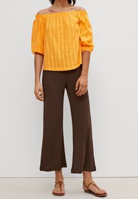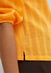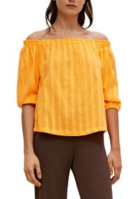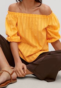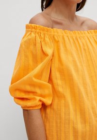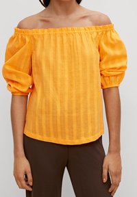 Blouse jaune à épaules dénudées avec manches bouffantes, présentant des rayures verticales et un tissu texturé. Matière douce et légère.