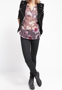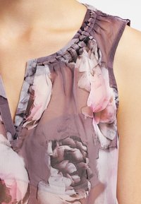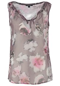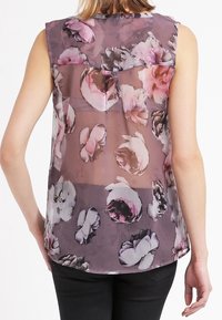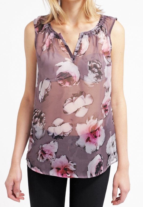 Blouse sans manches en voile transparent à imprimé floral rose et blanc, col à volants, portée avec un pantalon noir.