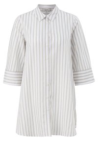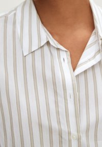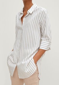 Chemise à boutons en blanc avec de fines rayures brunes. Dotée de manches retroussées, d'un col et de poches latérales. Fabriquée en tissu léger.