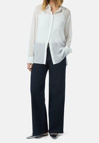 Personne portant un chemisier blanc à manches longues avec deux poches poitrine et un pantalon taille haute foncé sur un fond uni.