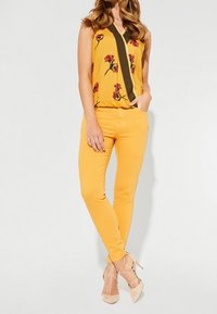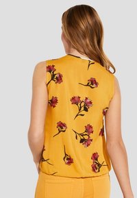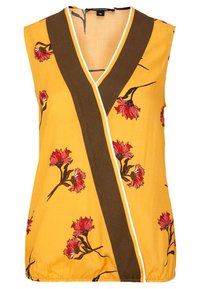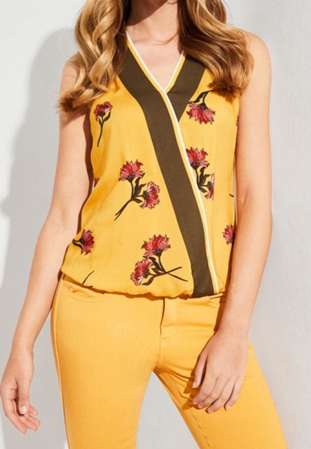 Blouse sans manches jaune avec imprimé floral, présentant une bande verticale verte foncée au milieu et un passepoil blanc. Texture de tissu lisse.