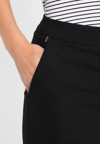 Femme portant un pantalon noir ajusté longueur cheville avec poches latérales et des talons noirs à bout pointu avec talons transparents ornés de pois noirs.