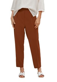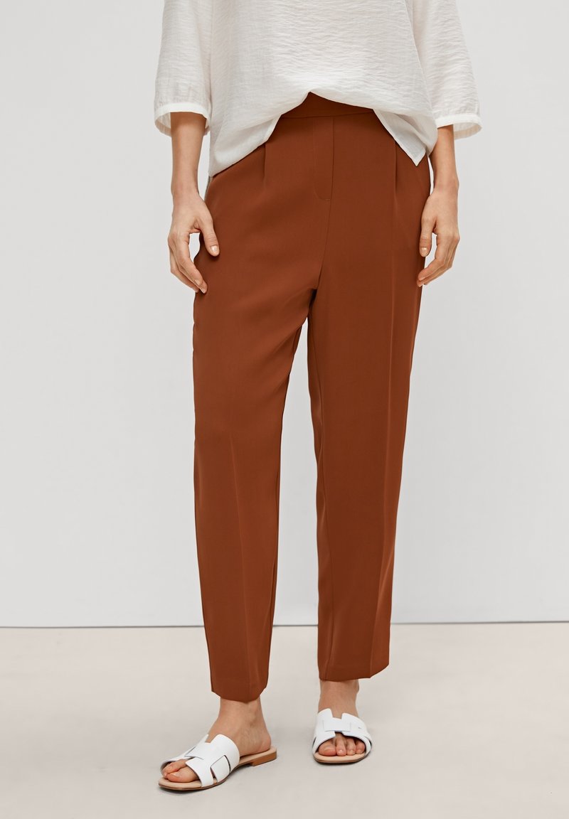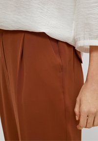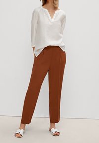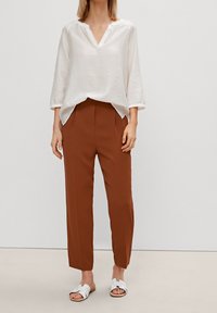 Personne portant un pantalon droit taille haute couleur rouille, un chemisier blanc à manches longues rentré, et des sandales blanches ouvertes à l'avant sur un fond uni.