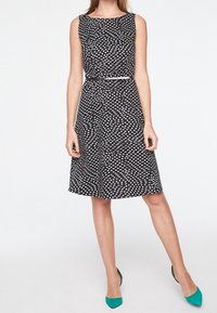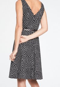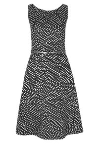 Robe noire avec un motif abstrait blanc, design sans manches, corsage ajusté, jupe évasée et une fine ceinture à la taille. Texture de tissu lisse.