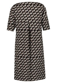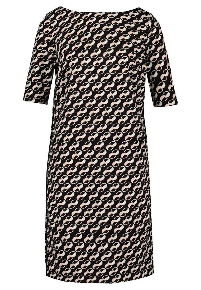 Robe noire hauteur genou avec manches à coudes, arborant un motif en chaîne ovale beige et rose clair se répétant.