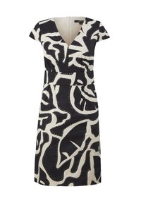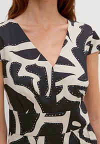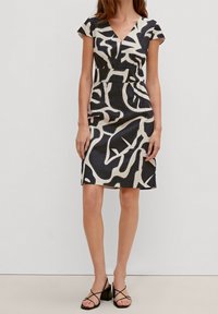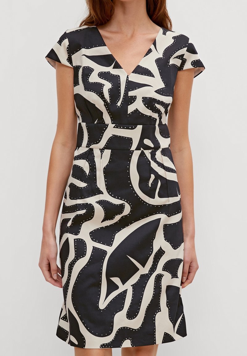 Robe à décolleté en V noire et crème avec manches courtes, présentant des motifs abstraits et des accents ponctués, en tissu lisse.