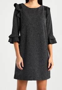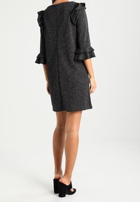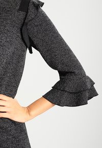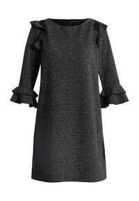 Robe gris foncé texturée longueur genou avec manches 3/4 volantées et accents noirs aux épaules sur une personne debout.