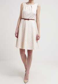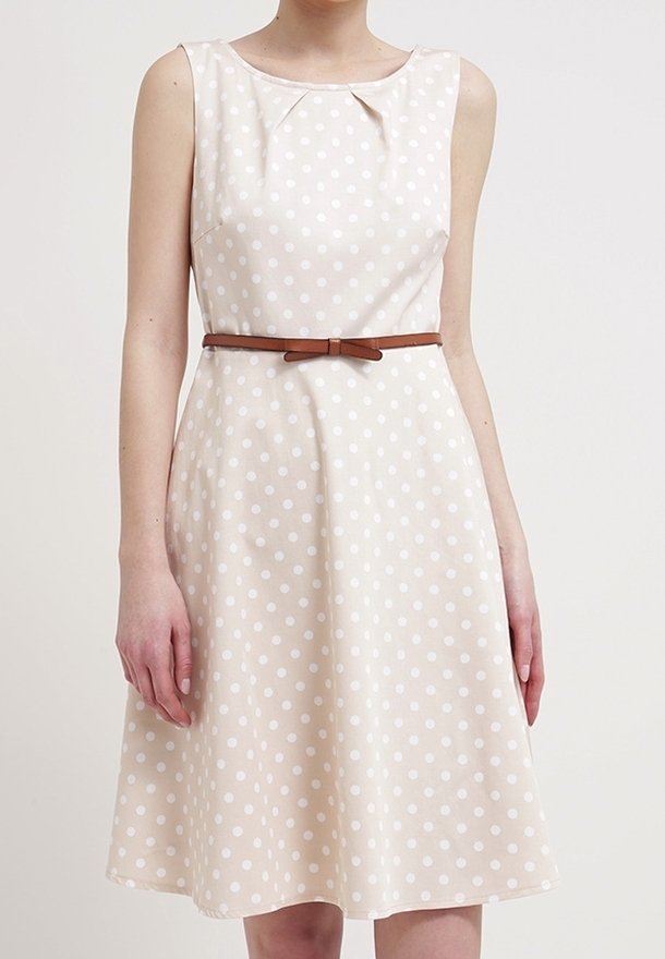 Robe beige à pois avec un décolleté arrondi, un design sans manches et une ceinture marron à la taille. Tissu lisse avec une jupe évasée.