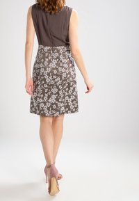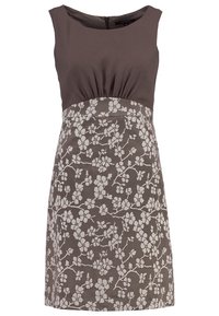 Femme portant une robe marron sans manches avec un motif floral blanc sur la jupe, assortie à des sandales à talons hauts roses avec bride à la cheville.