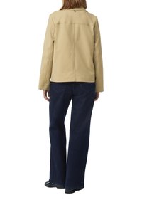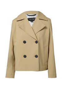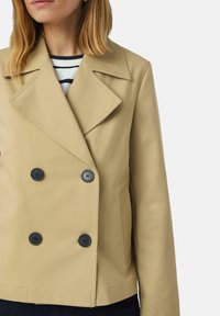 Veste beige à double boutonnage en tissu lisse. Elle présente de grands boutons noirs, un col cranté et deux poches latérales avec des détails texturés.