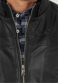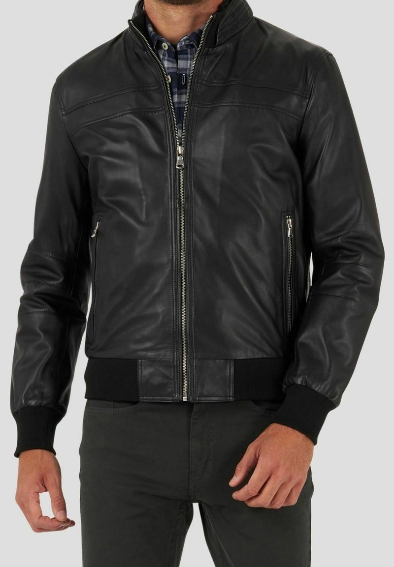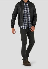 Homme portant une veste en cuir noire zippée par-dessus une chemise à carreaux bleue et un pantalon sombre, debout devant un fond uni.