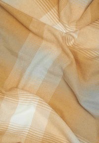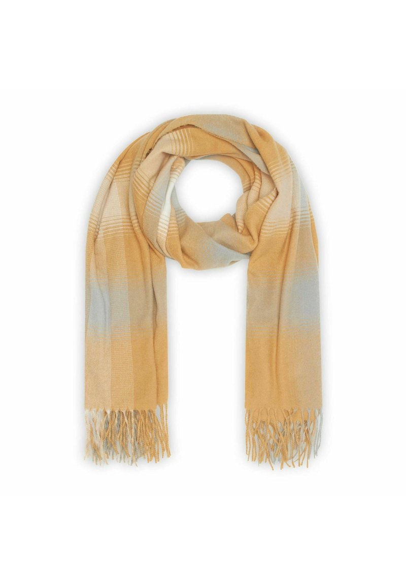 Écharpe à carreaux jaune et beige avec des extrémités à franges, pliée en boucle sur un fond blanc.