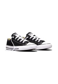 Baskets en toile noires basses avec lacets blancs, embout en caoutchouc, et semelle en caoutchouc rayée blanche, vues du côté extérieur sur un fond blanc.