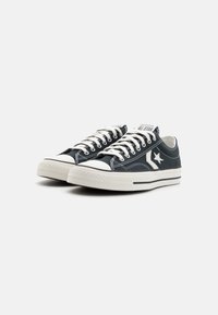 Baskets en toile bleu marine foncé avec embout et semelle extérieure en caoutchouc blanc. Elles présentent des lacets blancs et un logo étoile sur le côté, avec des rayures noires le long de la semelle.