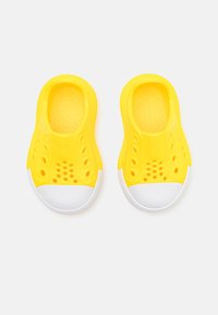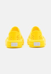Bottine jaune à enfiler avec un dessus en caoutchouc texturé, des trous de ventilation circulaires, un capuchon de orteil en caoutchouc blanc et une semelle épaisse assortie.
