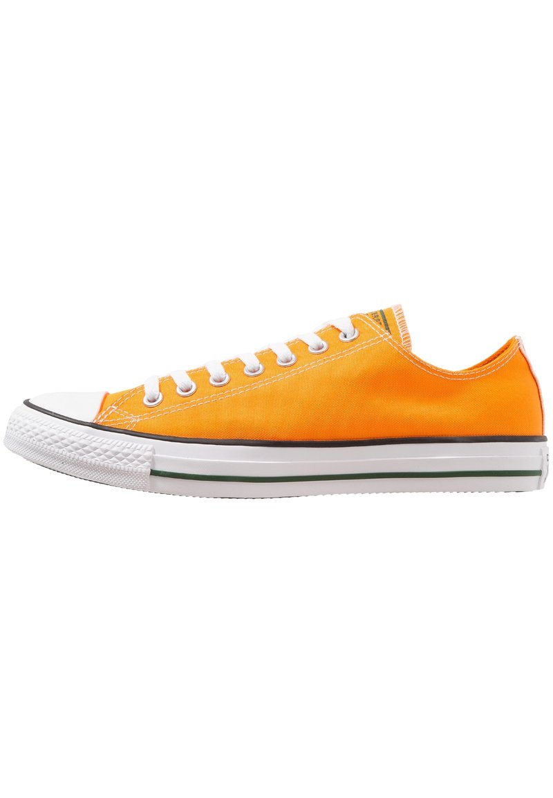 Baskets en toile orange avec embout en caoutchouc blanc, lacets et semelle. Présente un design profil bas avec des bandes d'accent noir et vert.