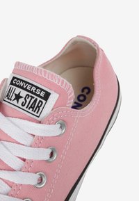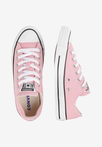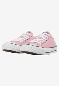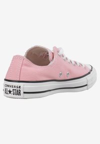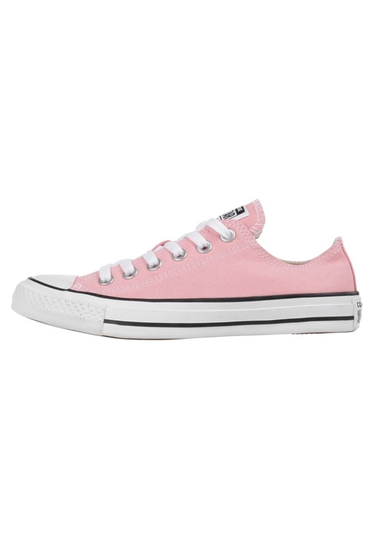 Baskets basses en toile rose avec semelle en caoutchouc blanche, lacets blancs et détails à rayures noires.