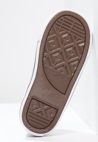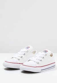 Baskets en toile blanches avec bout rond, semelle en caoutchouc, accents rouge et marine, et cinq œillets pour les lacets. Design épuré et minimaliste.
