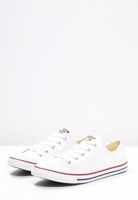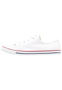 Baskets basses en toile blanche avec semelles en caoutchouc, comprenant un patch logo noir, des œillets argentés et une bande rouge le long de la semelle. Portées avec un pantalon gris.