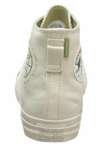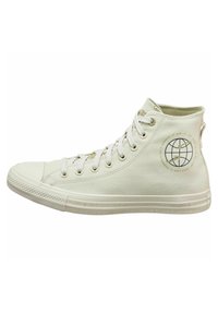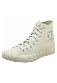 Basket montante en toile blanc cassé avec lacets blancs, semelle en caoutchouc et emblème circulaire représentant un globe sur la partie extérieure de la cheville.