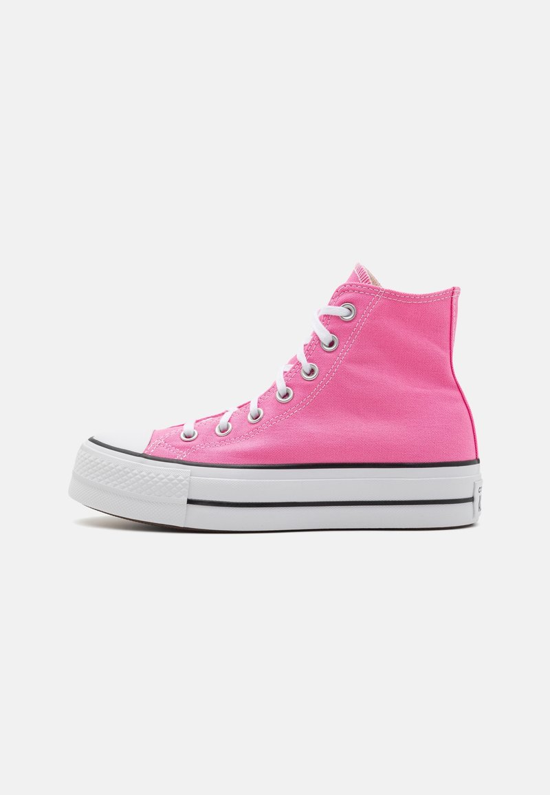 Baskets montantes en toile rose vif avec une coque en caoutchouc blanc, une bande noire sur la semelle, des œillets argentés et des lacets blancs.
