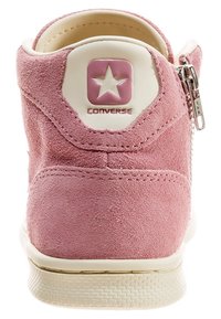 Baskets montantes en daim rose doux avec lacets blancs et logo étoile en accent. Dotées d'une semelle en caoutchouc texturée et de détails cousus.