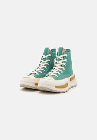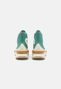 Baskets montantes en toile bleu sarcelle, avec des lacets blancs, des semelles en caoutchouc avec des accents beige, et un col rembourré pour le confort.