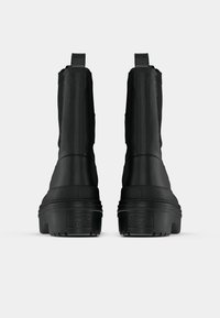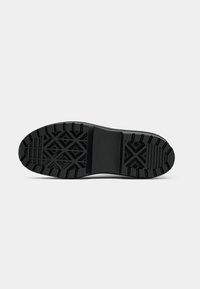 Bottine en cuir noir avec semelle en caoutchouc épaisse et languettes de tirage, présentée suspendue au-dessus d'une surface en béton dans un décor industriel minimaliste.