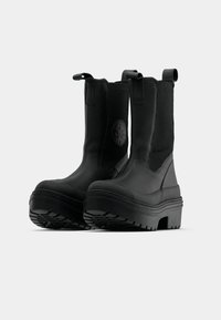Baskets montantes noires en cuir texturé avec semelle plateforme en caoutchouc blanc. Présente des œillets métalliques et un bout renforcé. Marquage discret au talon.