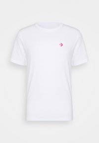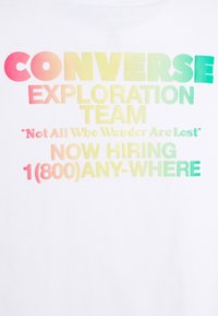 Personne aux cheveux blonds courts, tatouages sur le cou et les bras, portant un t-shirt blanc avec un texte coloré "Converse Exploration Team" et un jean bleu.