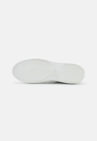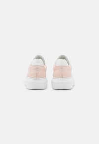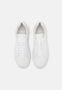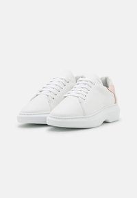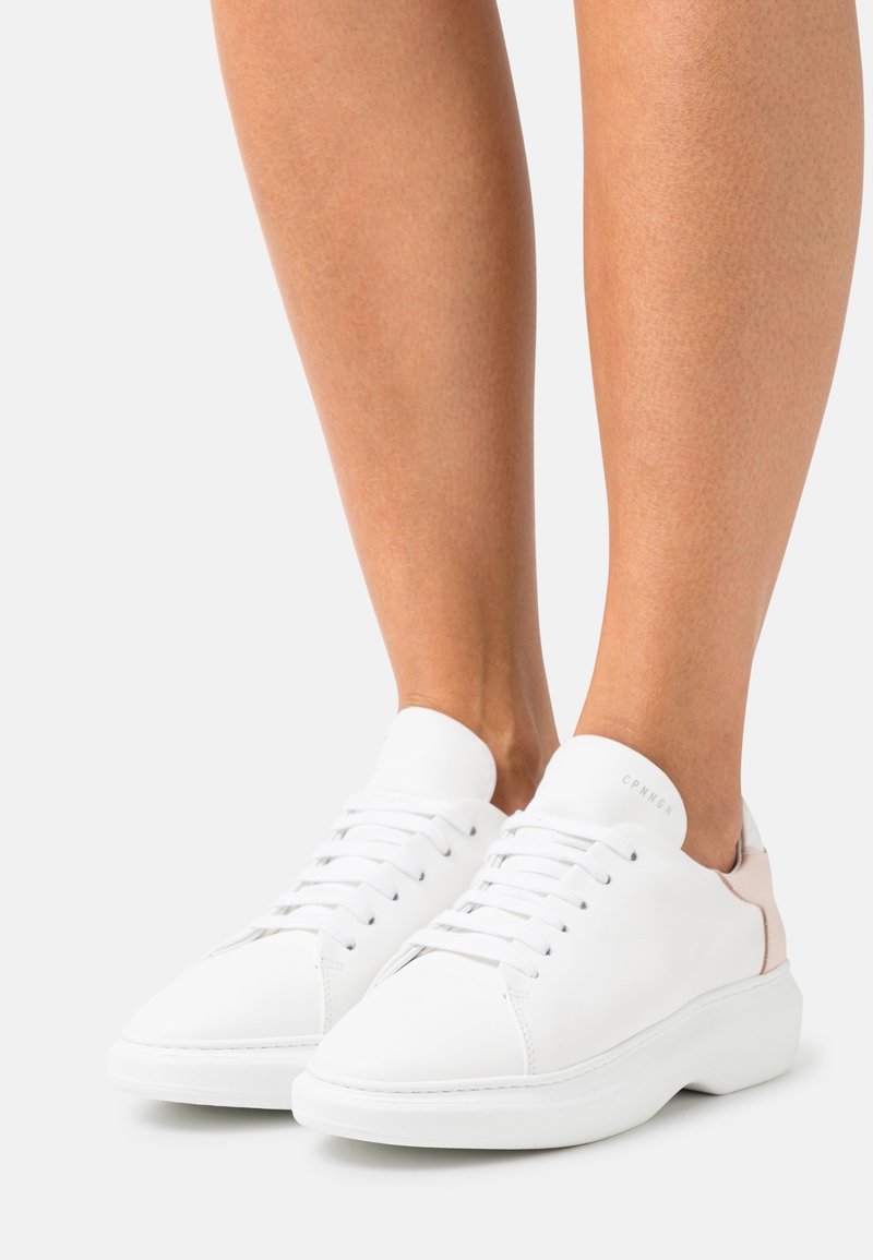 Baskets en cuir blanc à la texture lisse, bout arrondi, lacets, et un accent rose près du talon. Design minimaliste, lignes épurées.