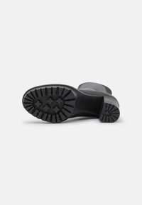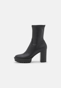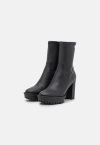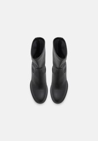 Bottes cheville en cuir noir à finition lisse, design à enfiler, bout arrondi et talon bloc avec une semelle texturée et rainurée.
