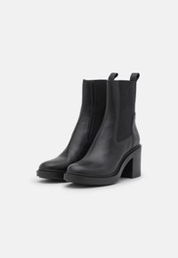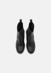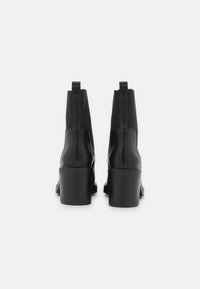 Bottes cheville en cuir noir avec un talon épais, des panneaux latéraux élastiques et une finition lisse. Le design présente une esthétique minimaliste.