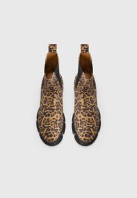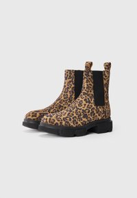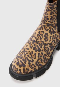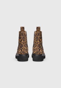 Bottine montant à la cheville avec imprimé léopard, panneau latéral élastique noir, languette de tirage et semelle noire épaisse, vue de profil sur fond blanc.