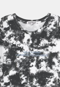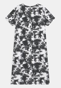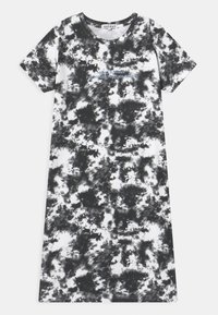 Robe à manches courtes tie-dye noire et blanche avec un col rond et un petit texte centré indiquant "BONJOUR ÉTÉ TU M'AS MANQUÉ FOU."