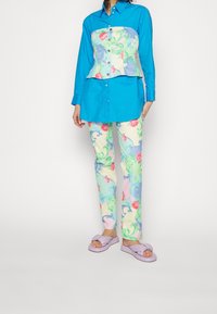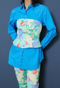 Chemise boutonnée bleue avec un corset à motif floral superposé, associée à un pantalon pastel à motifs et des sandales à enfiler de couleur violet clair.