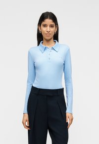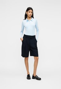 Femme aux longs cheveux noirs portant un polo à manches longues bleu clair et un pantalon noir taille haute, debout devant un fond uni.