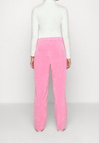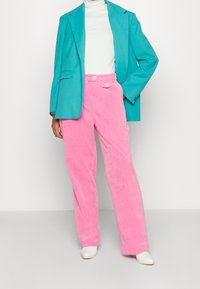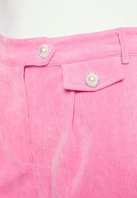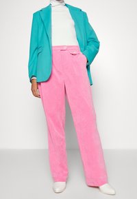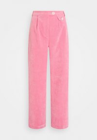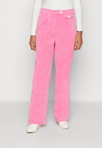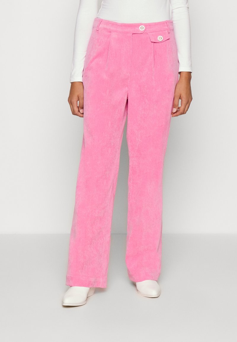 Femme portant un pantalon en velours côtelé rose à taille haute et jambes larges avec des détails à boutons, associé à un haut blanc à manches longues et des chaussures blanches.