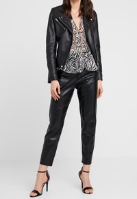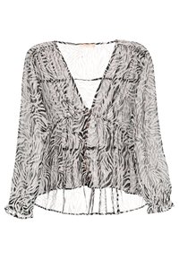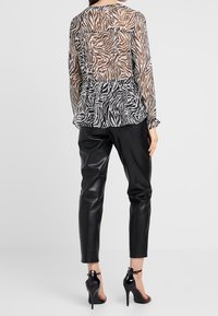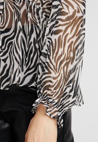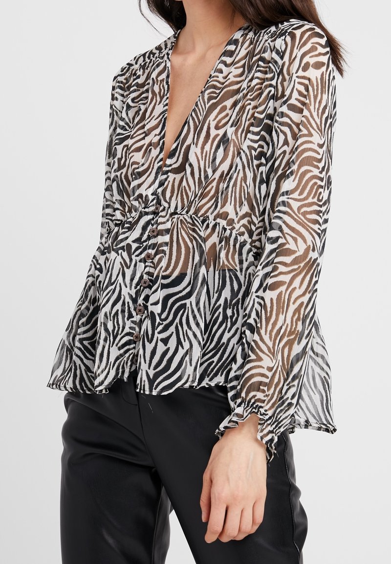 Femme portant un chemisier semi-transparent boutonné à manches longues avec un imprimé zèbre noir, marron et blanc, associé à un pantalon noir.