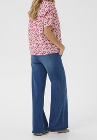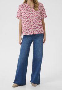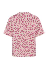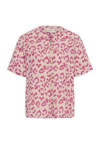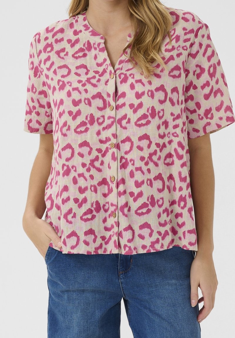 Blouse à manches courtes en tissu léger avec un motif léopard rose, dotée d'un col en V et d'une fermeture à boutons. Mannequin présenté avec un jean bleu.