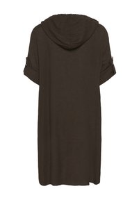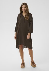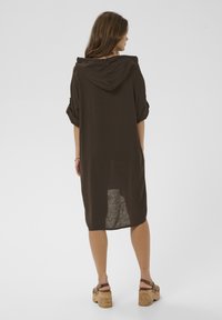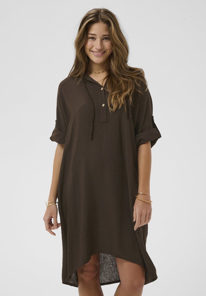 Jeune femme souriante, portant une robe marron ample aux manches retroussées et des bracelets dorés, posant devant un fond clair uni.