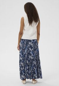 Femme aux longs cheveux bouclés portant un haut blanc en dentelle sans manches et une jupe bleue à fleurs, posant avec une main tenant son haut.