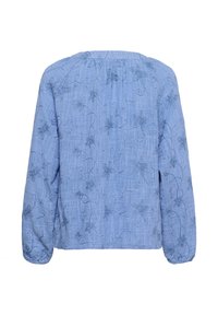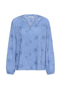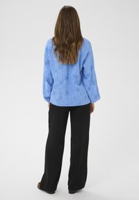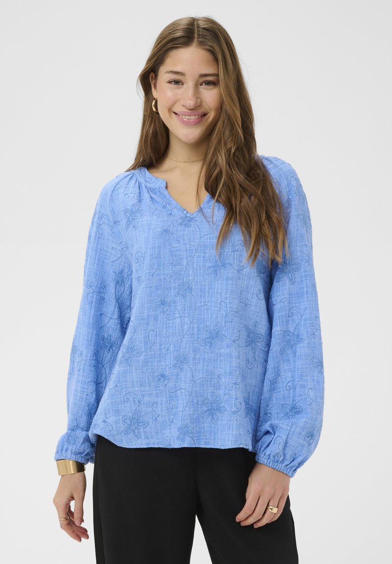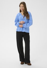 Jeune femme aux longs cheveux bruns portant un chemisier bleu à fleurs texturé à manches longues et un pantalon noir, souriant à la caméra.
