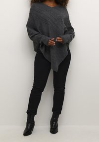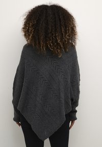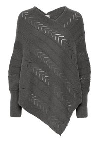 Poncho gris tricoté avec un col en V, présentant des motifs chevrons texturés et des manches larges, tombant de manière asymétrique vers l'ourlet.