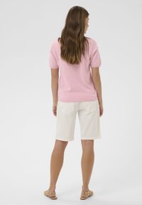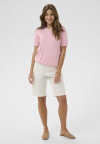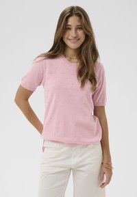 Jeune femme aux longs cheveux bruns portant un haut rose texturé à manches courtes et des bijoux en or, regardant vers sa droite sur un fond uni.